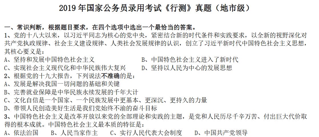 先说行测。行测基本照搬了广泛应用于西方公务员考试和企业招聘的能力倾向测试框架:言语理解、数量关系、判断推理、资料分析分别对应能力测试的语言(Verbal)、数量(Numerical)、逻辑(Logical)、图表分析(Diagrammatic),更不用说其全称就包含了“能力倾向测试”字样。但中国的考公也有自身的“中国特色”:在上述四大部分以外还有第五部分的“常识判断”,在考公制度初期,这个部分还算名实相符,主要考察中国现行法律、行政规章、自然科学、历史地理等方面,但最早自2011年起,常识判断部分就越发政治化,例如: