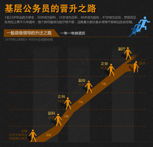 1990年前后,中央提出干部年轻化,明确各级领导班子平均年龄指标,这意味着官僚若未能在年龄超线之前实现相应级别的晋升,晋升机会几乎消失。根据2013年《晶报》的说法(未能找到原始文本,但在《香城都市报》中有所提及可以证实),“如果你不能在35岁升到正处,45岁升到正厅,那么你的仕途很可能将从此止步。”又:“当今中国,干部升迁是要划出一定杠杠的。比如,副处,一般35岁以下,副局,一般45岁以下,副部,一般55岁以下。”