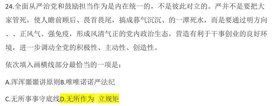 “言语理解”部分的原意是筛选出语言能力较强的测试个体,但在公考中却演变成了筛选“与党国话语体系更加同频”的个体。随着习式土味话语(压茬推进、撸起袖子加油干、啃下脱贫硬骨头、刀刃向内等等)在党国体系内的蔓延,言语理解也日益“土味化”: