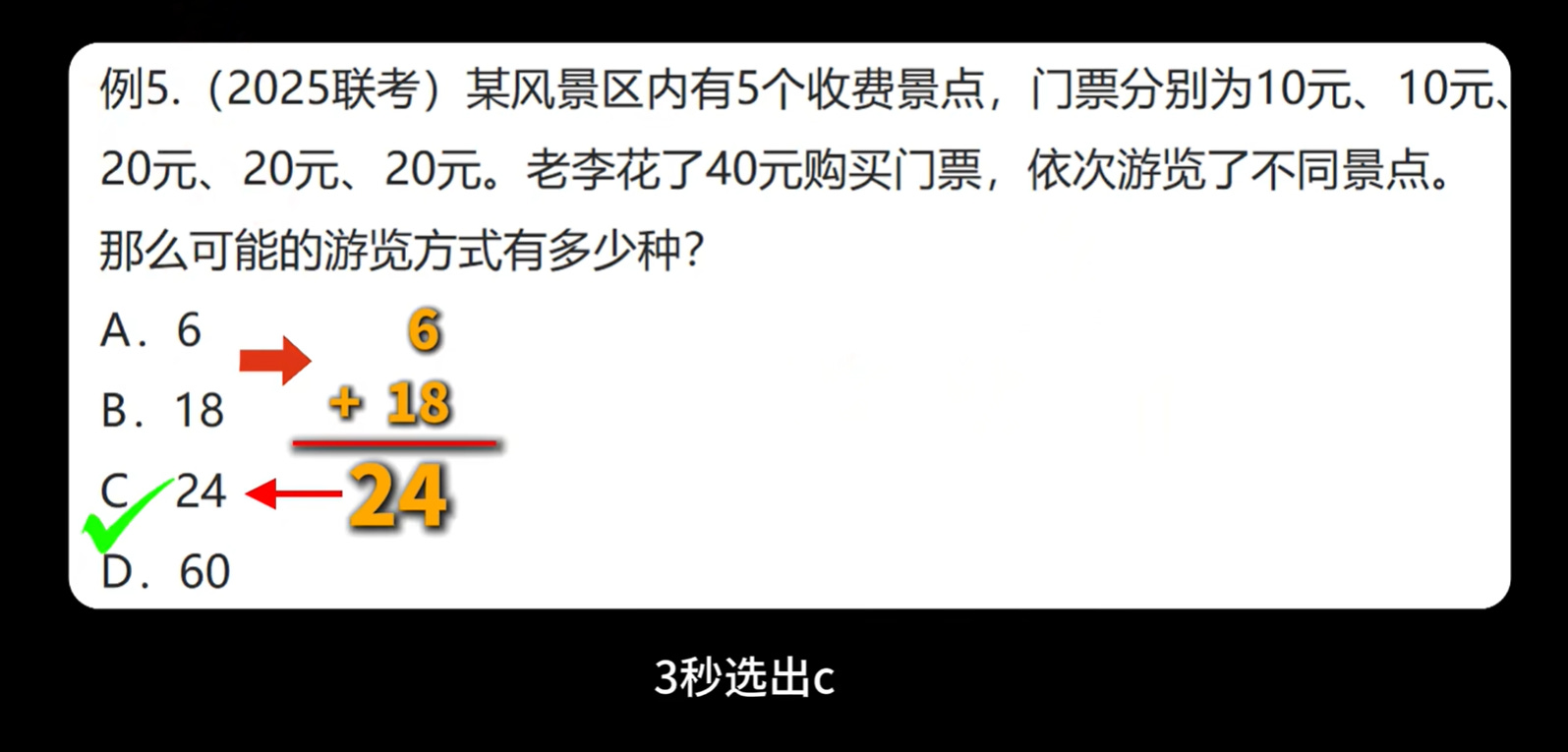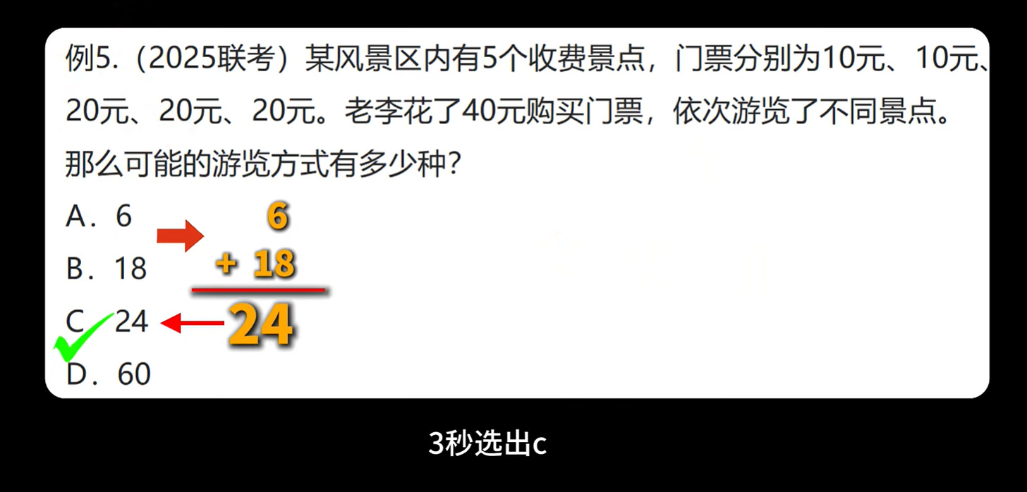 由于五种题目的难度和耗时不同,考生在备考时必须考虑刷题的性价比差异:首先,题海战术基本只对“数量关系”和“判断理解”两部分起作用,而受制于时间压力,考生往往选择投机取巧,通过相关课程和机构总结出的“秒题”办法,在无需理解题目的情况下迅速做完题目。例如:(源自B站“白天带你考公”)