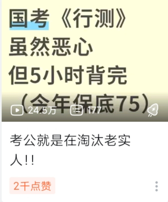 这是我在b站上看到最多的两句广告词:“淘汰老实人”和“虽恶心但有用”。让我好奇的是其背后的考生心理:有没有可能,实际投身于考公的中国年轻一代,其实也觉得考公恶心,也没那么“粉红”,也只是在钻制度的空子、寄望于奇技淫巧或所谓“邪修”办法?
