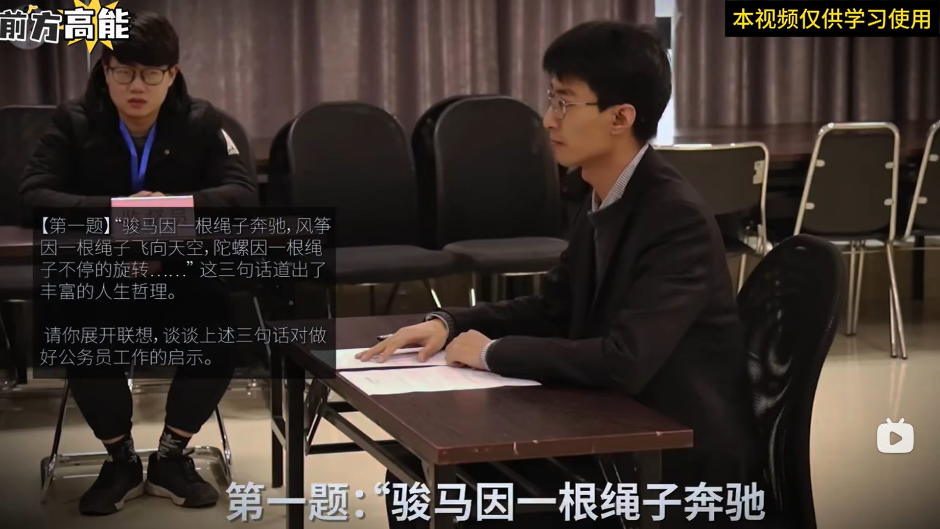 笔试分数排名前几的将进入面试环节。面试一般分为两种:结构性面试、无领导小组讨论。结构性面试就是固定题目,要求考生在规定时间内口头回答问题。下面的视频是一次模拟面试:(【超99%备考人员,真实公务员面试考场85.6高分,结构化面试完整流程大公开 压迫感十足!】 )