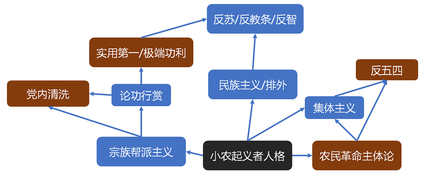 小农思维的封闭保守自然导向民族主义和排外,农民群体对苏联教条和理论浓度天然反感,毛利用这一点(或许他本人也完全接受这一点)去反苏、反教条、进而走到反智的地步;小农也亲近集体、反感个人主义,对五四价值诸如自由、民主、个性解放并不感冒,又有农民革命主体论的加持,更容易走向反五四反自由的立场;作为农民起义者,“参加中共党组织的农民中还包含许多「帮会」分子”,哥老会、洪会等帮派传统深厚,自然更熟悉论功行赏、排座次等“梁山好汉”做派,也更警惕“我们中出了个叛徒”(难怪有人将杜琪峰的电影《黑社会》系列看作是中共党内生活的真实写照),而论功行赏与政治极端功利的原则并行不悖且互相强化,一切以结果论英雄,不择手段自然是帮派的家常便饭。实用第一的原则又助长了农民群体的反智倾向。