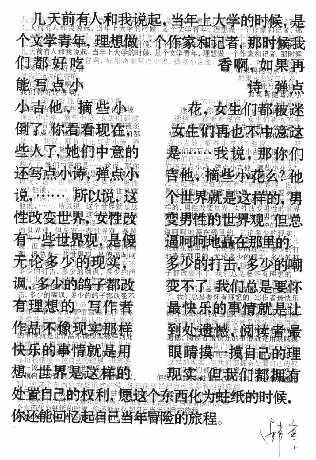 “我们总是要怀有理想的。写作者最快乐的事情就是让作品不像现实那样到处遗憾,阅读者最快乐的事情就是用眼睛摸一摸自己的理想。世界是这样的现实,但我们都拥有处置自己的权利,愿这个东西化为蛀纸的时候,你还能回忆起自己当年冒险的旅程。”